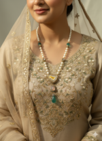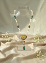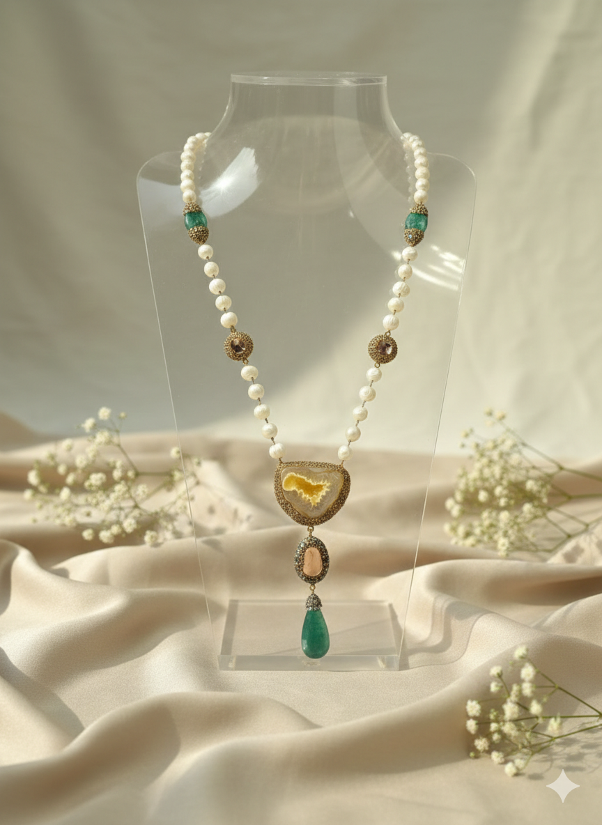 Crafted to make a lasting impression, this elegant locket/maala blends intricate detailing with a bold yet graceful design. Its finely set stones and luxurious finish create a look that speaks of royalty and refined taste. Perfect for weddings, festive occasions, or elevating your formal attire. The pattern on the natural stone in it is one of a kind in this whole world.