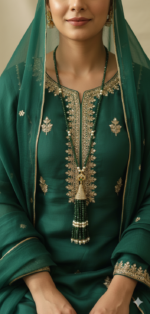 Crafted to make a lasting impression, this elegant Turkish locket/maala blends intricate detailing with a bold yet graceful design. Its finely set stones and luxurious finish create a look that speaks of royalty and refined taste. Perfect for weddings, festive occasions, or elevating your formal attire.