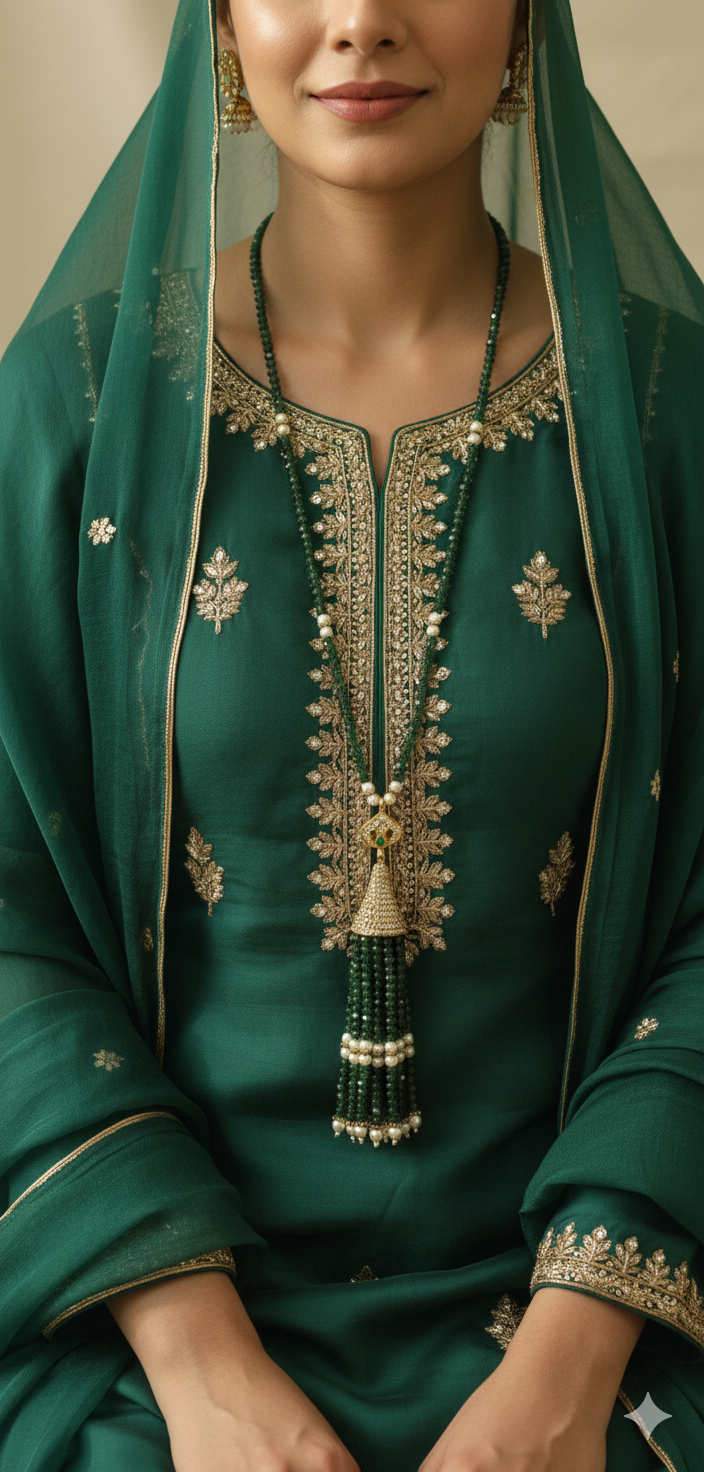Crafted to make a lasting impression, this elegant Turkish locket/maala blends intricate detailing with a bold yet graceful design. Its finely set stones and luxurious finish create a look that speaks of royalty and refined taste. Perfect for weddings, festive occasions, or elevating your formal attire.