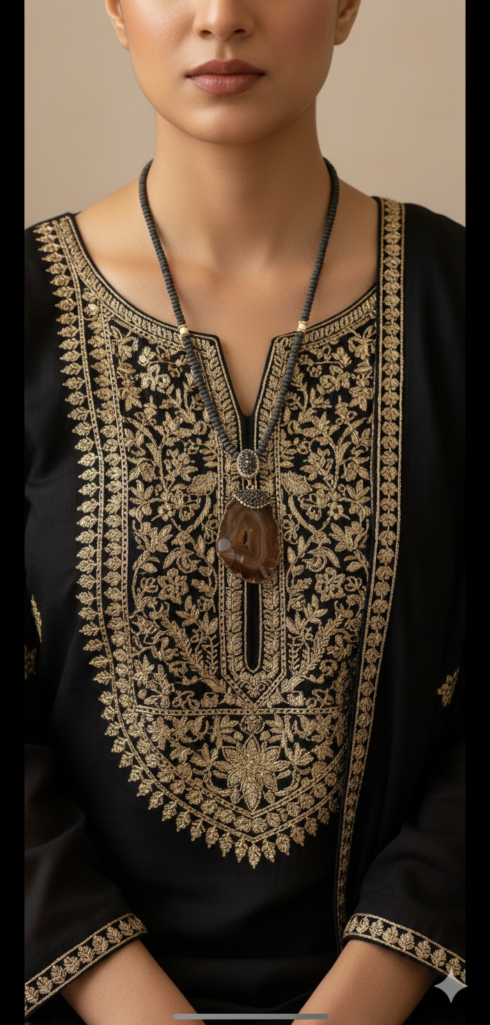 Crafted to make a lasting impression, this elegant Turkish locket/maala blends intricate detailing with a bold yet graceful design. Its finely set stones and luxurious finish create a look that speaks of royalty and refined taste. Perfect for weddings, festive occasions, or elevating your formal attire. The pattern on the natural stone in it is one o a kind in the world.